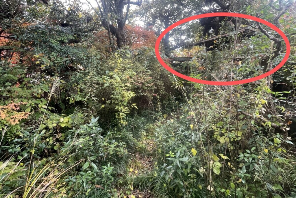 赤く丸をしているところが門ですが、色んな植物が生えっぱなしで、通るのをためらうくらいの状態でした。